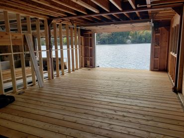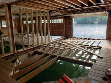 We raised the building 16 inches, replaced all the beams and decking, added and sundeck and full height doors to give this boathouse a new life