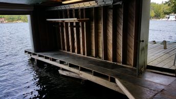 We raised the Boathouse off the old cribs, pulled out and rebuilt the cribs with rot resistant materials, leveled the walls and dock and installed a new door for security.